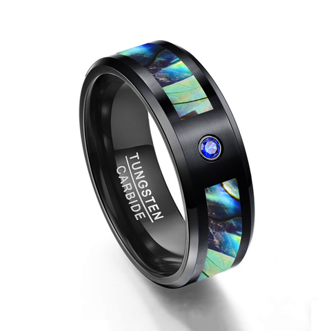 Anneau plat en carbure de tungstène noir en coquille d'ormeau hawaïen naturel de 8mm en zircon cubique